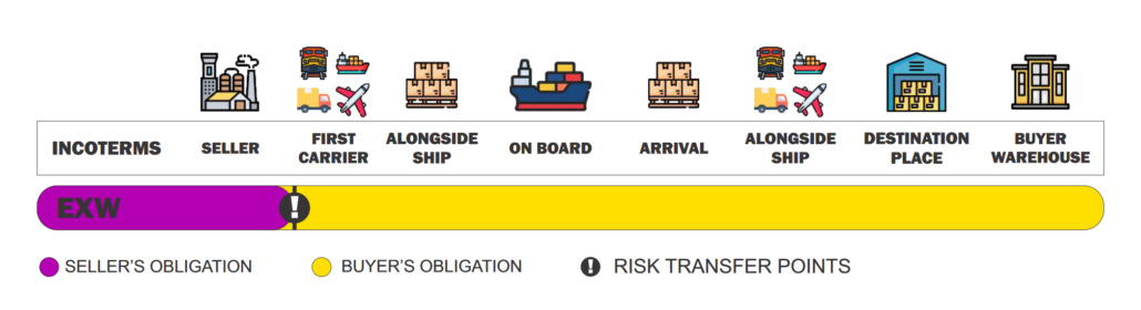 Group E of Incoterms 2020 includes a single term called EXW (Ex Works). or delivered to the door of the factory . In this term, the minimum obligations are the responsibility of the seller and the most obligations are the responsibility of the buyer .